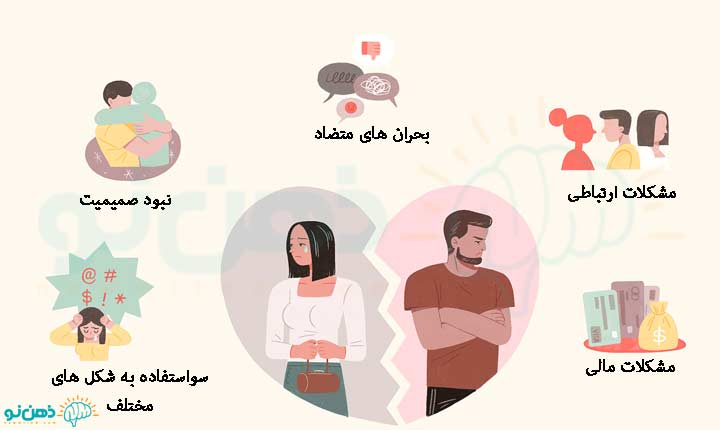 همانطور که گفتیم زندگی مشترک در کنار تمامی شیرینیهایی که دارد مشکلات و چالشهای بسیاری نیز برایتان خواهد داشت. این مشکلات و سختیها با توجه به شخصیت شما و طرف مقابل، فرهنگی که در آن زندگی میکنید و شرایط زندگیتان متفاوت خواهد بود. اما بعضی از مشکلات با احتمال بیشتری در زندگی اکثر ما اتفاق میافتند. به همین خاطر لازم است که با این مشکلات آشنا شوید و برای برطرفکردن آنها برنامه مشخصی داشته باشید. این مشکلات به شرح زیر است.