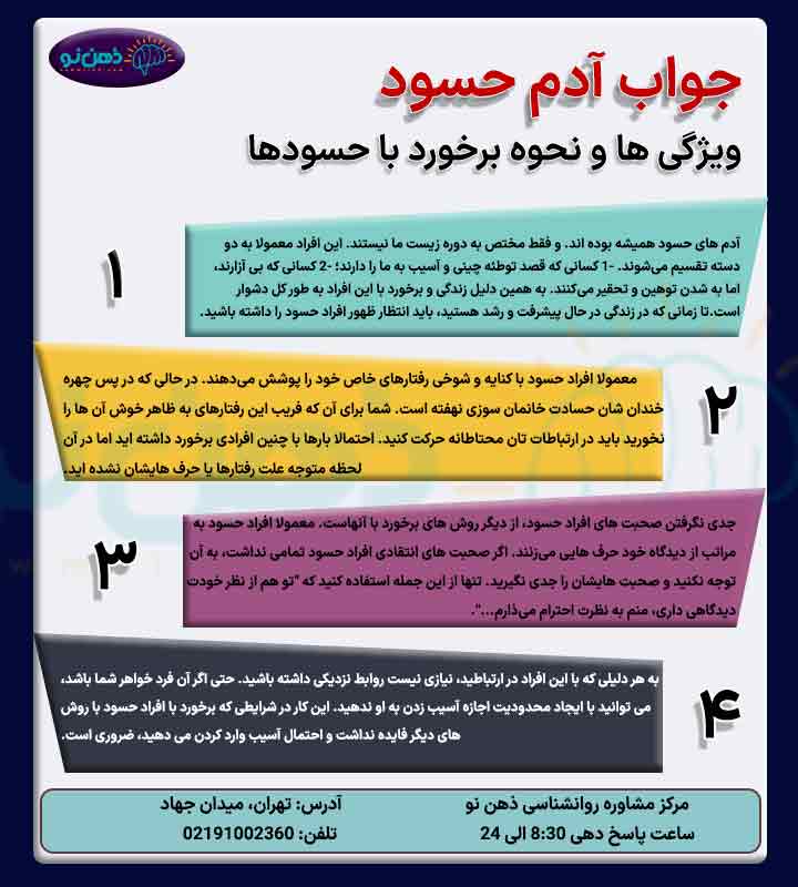 برای دریافت مشاوره در زمینه جواب آدم حسود می‌توانید در هر ساعت از روز برای مشاوره تلفنی از طریق شماره 02191002360 و یا از طریق تلفن ثابت با شماره 9099070354 جهت ارتباط با برترین متخصصان در مرکز مشاوره روانشناسی ذهن نو تماس حاصل نمایید.