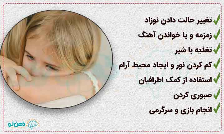 سرد و گرمی هوای محیط نوزاد را بررسی نمایید. دمای اتاق و محیط کودک را متناسب با اینکه کودکتان گرمایی یا سرمایی است، تنظیم کنید. برای این کار باید لباس مناسب فصل و طبع کودک به تن او کنید.