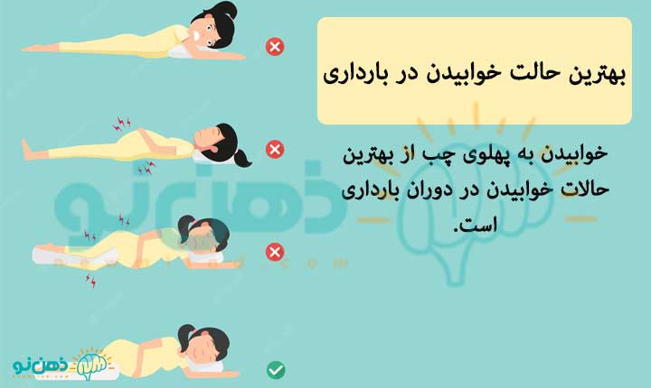 در صورتی در به خواب رفتن و یا تدام خواب در طول شب مشکل دارید، حتما مقاله درمان بی خوابی را مطالعه نمایید. پس بهترین حالت خوابیدن برای زنان باردار خوابیدن به پهلوی چپ خواهد بود. گرچه با گذشت زمان بزرگ شدن سایز شکم مادر، حتی خوابیدن در این وضعیت نیز برای او سخت خواهد بود.